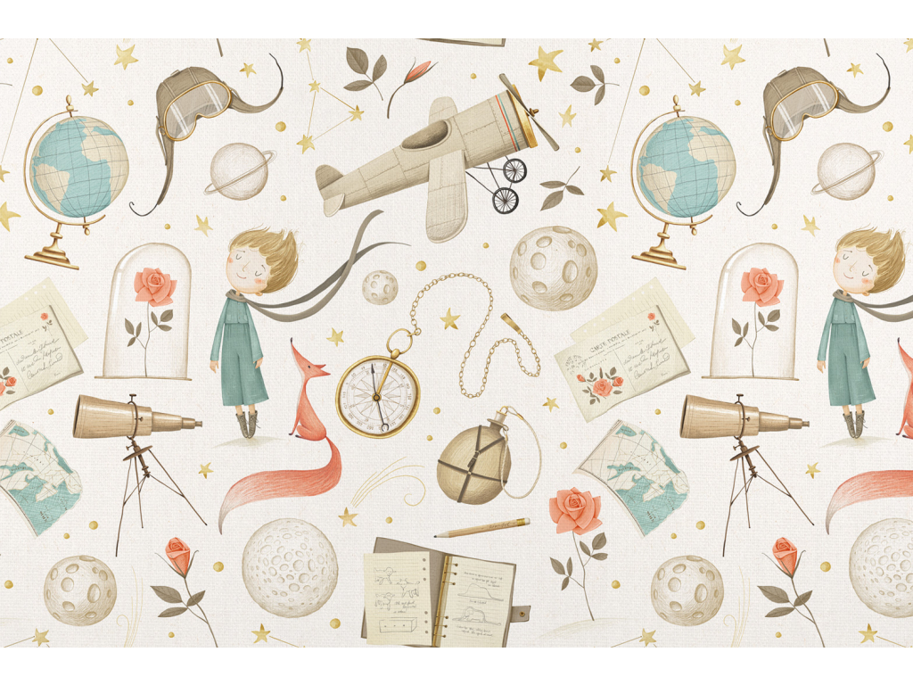 Představujeme vám naše bavlněné plátno se vzorem Malý princ - smetanová. Najdete zde motivy malého prince, letadla, globusu, hodin, dalekohledu a mnoho dalšího. Tyto prvky jsou inspirovány slavným příběhem Malý princ od Antoine de Saint-Exupéryho. Obrázky přinášejí do motivu dojem dobrodružství, zvědavosti, a tajemství.