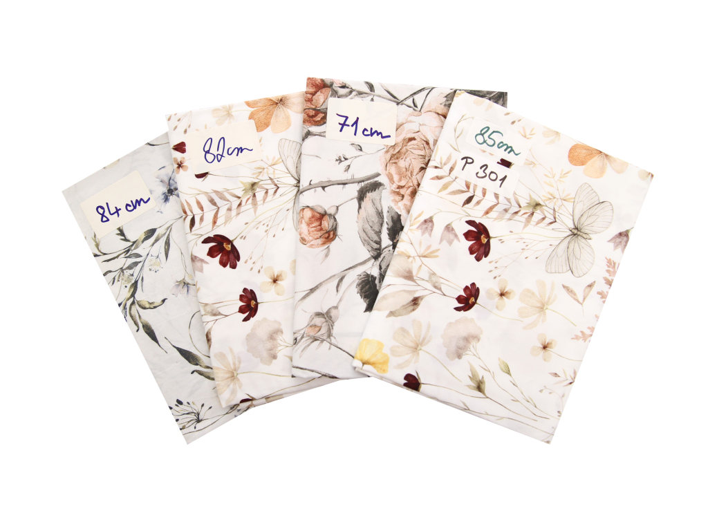 Šířka látky je 160 cm. Jemnost příze 20 TEX. Vzor je na látku tištěn precizním digitálním tiskem, který je velmi kvalitní a stálobarevný.