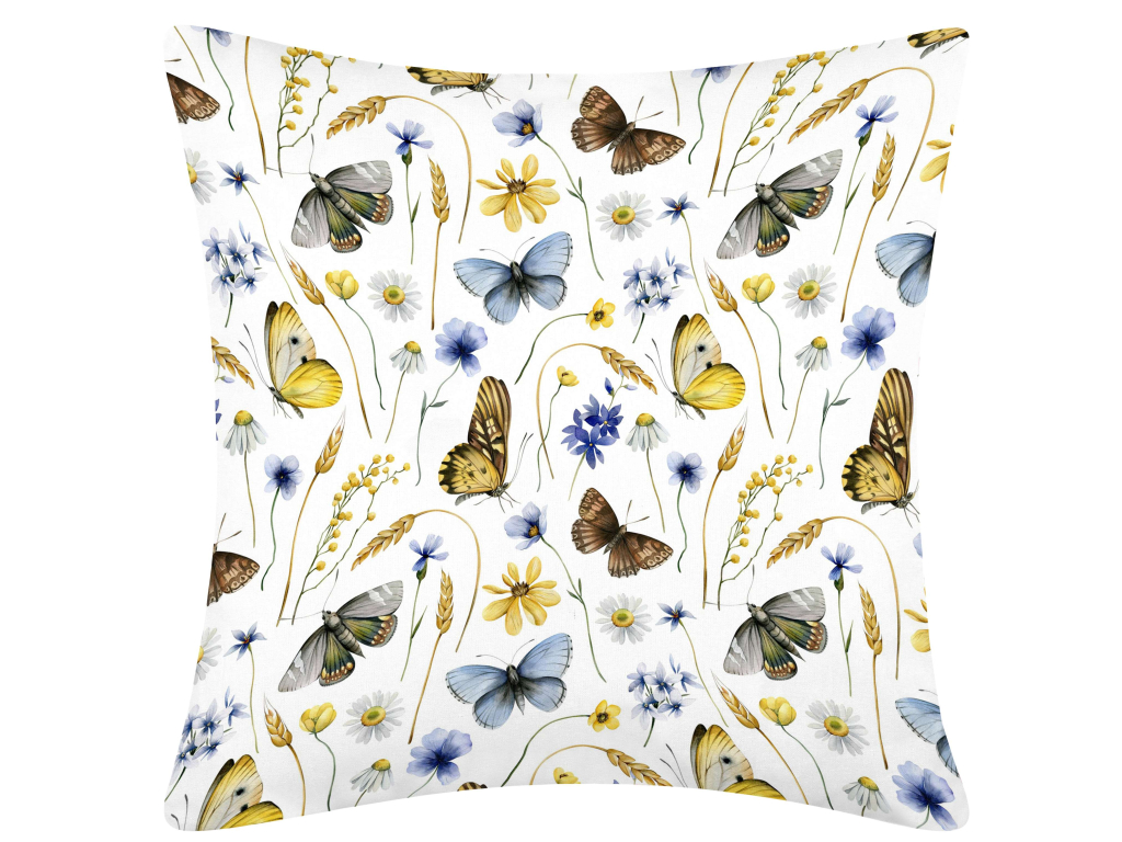 Žlutomodré kvítí - tento povlak na polštářek je jako jarní louka v plném květu s živým vzorem motýlů a květin. Na světlém pozadí jsou roztroušeny různé druhy motýlů, od jemných světle žlutých po temnější hnědé odstíny, které jsou doplněny modrými a žlutými květy. Povlak se bude krásně vyjímal v interiéru, který si cení jemnosti, přírody a barevného šarmu.