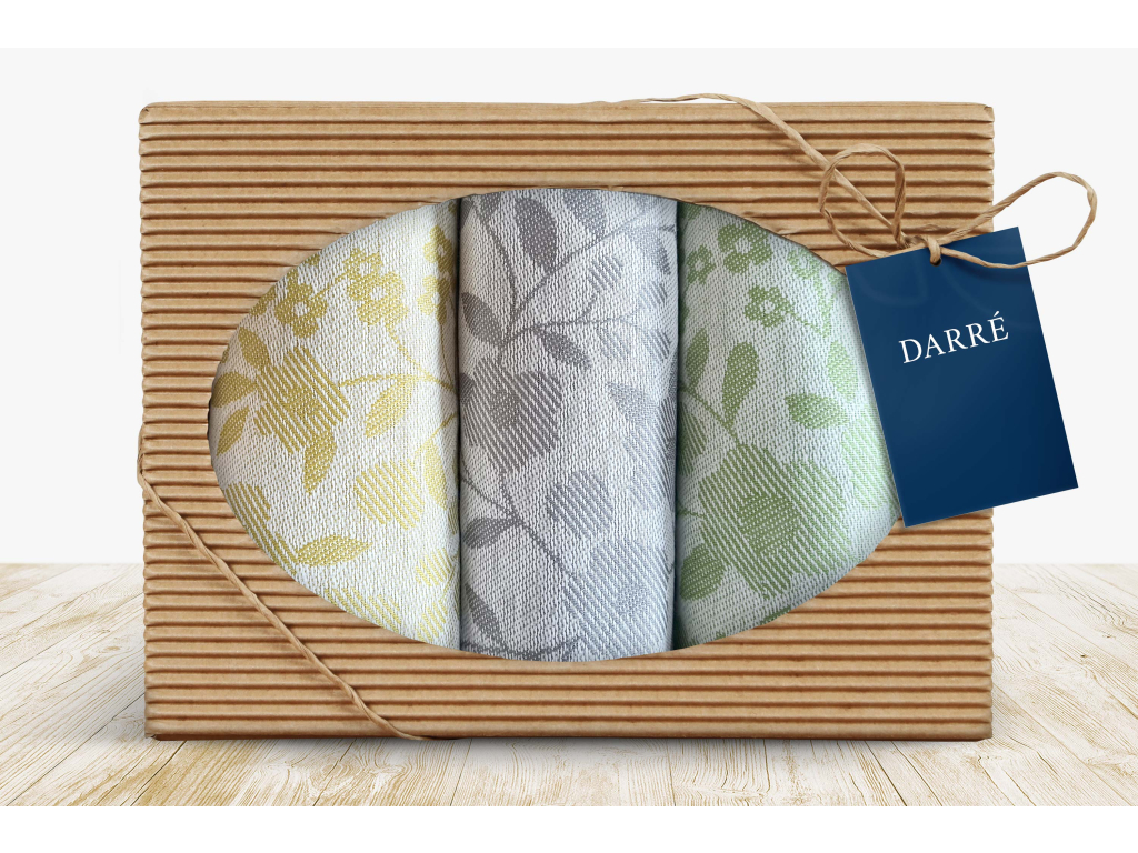 V kazetě jsou 3 ks utěrek Kytičky - olivová, zelená, šedá