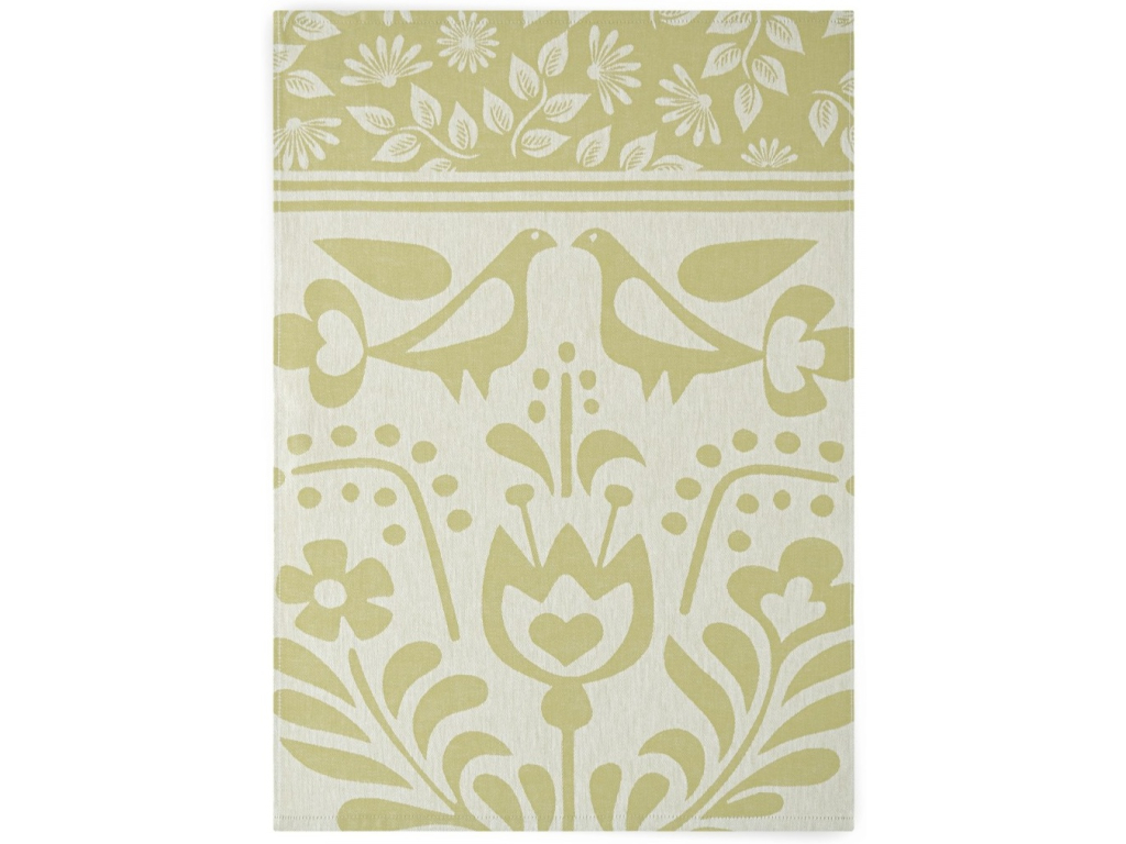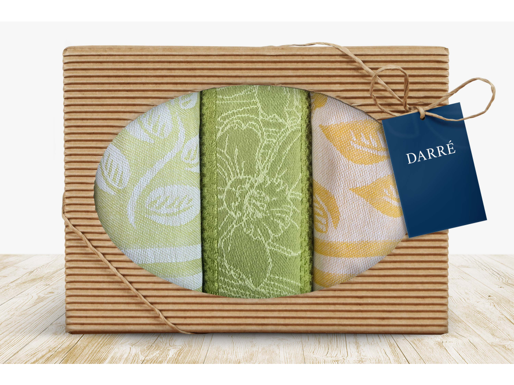 V kazetě jsou 2 ks utěrek Holubice - světle zelená, žlutá a 1 ks ručníku Narcisky - zelená