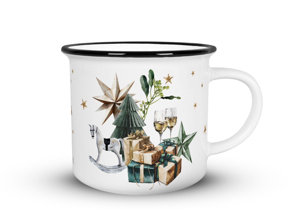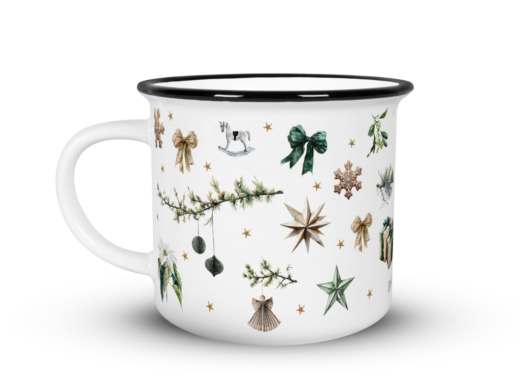Keramické hrnečky v designu plecháčku mají ozdobnou černou linku po obvodu horního lemu. Hrnečky jsou tištěny kvalitním sublimačním tiskem přímo u nás v Náchodě. Objem hrnečku je 236 ml a potěší milovníky čaje, ale i větší kávy. Vánoční vzor, který voní jehličím, stromky a perníkovým kořením.