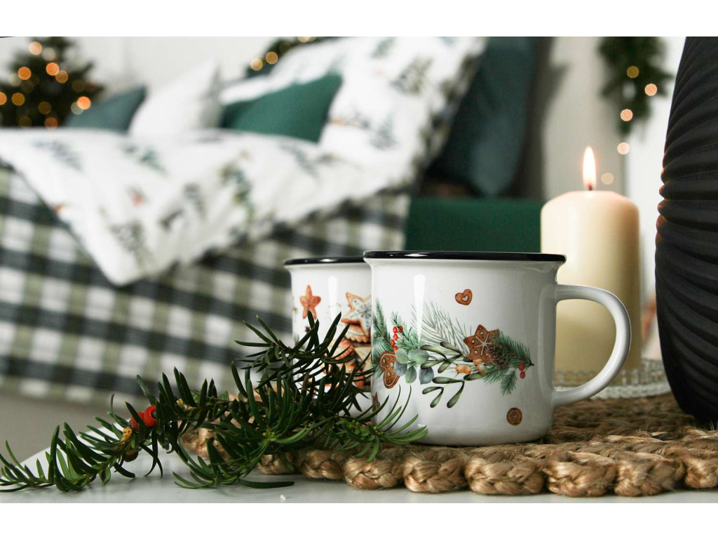 Keramické hrnečky v designu plecháčku mají ozdobnou černou linku po obvodu horního lemu. Hrnečky jsou tištěny kvalitním sublimačním tiskem přímo u nás v Náchodě. Objem hrnečku je 236 ml a potěší milovníky čaje, ale i větší kávy. Vánoční vzor, který voní jehličím, stromky a perníkovým kořením.